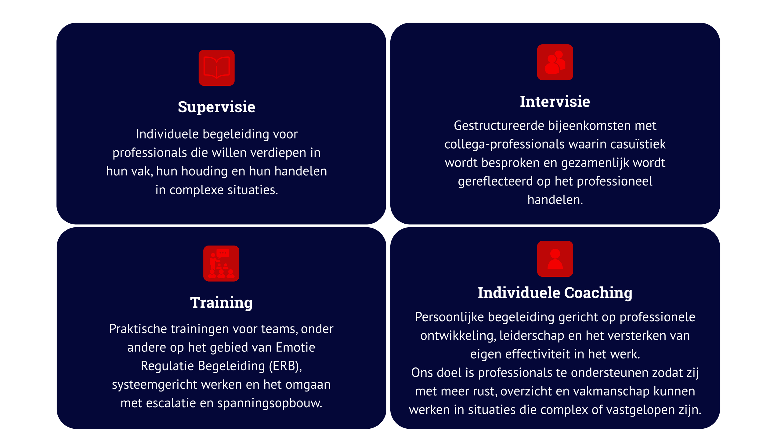 Onze focus ligt op het versterken van vaardigheden, reflectie op het eigen handelen en het vergroten van professionele veerkracht.